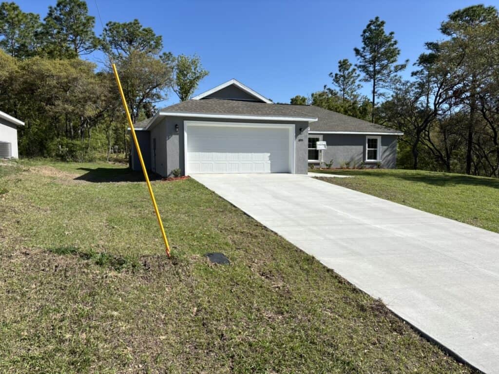 NEW CONSTRUCTION. MOVE-IN READY! This New Amelia Model offers 3 bedrooms, 2 bathrooms, and 1,662 square feet in the desirable community of Citrus Springs. Built with concrete block construction, a 30-year architectural shingle roof, energy-efficient double-pane windows, and backed by a 10-year structural warranty, this home delivers quality and peace of mind. Inside, the living room features a vaulted ceiling, while the master bedroom showcases a tray ceiling with crown molding. Luxury vinyl plank flooring runs through the main living areas and bedrooms, with marble-look tile in both bathrooms. The kitchen is beautifully appointed with stainless steel appliances, custom white shaker cabinets with soft-close drawers, granite countertops, a subway tile backsplash, a built-in pantry, wrap-around refrigerator cabinetry, and an oversized island with large cabinets underneath. Both bathrooms feature double vanities with granite countertops, and the primary suite includes a large shower with dual showerheads and two walk-in closets. Additional highlights include a large laundry room with custom cabinets and granite countertops, folding space, a flexible mud room or office, washer and dryer hookups, a covered patio, and an attached 2-car garage with an opener and remotes. Enjoy ownership freedom with no HOA and a high and dry location in flood zone X, where no flood insurance is required.